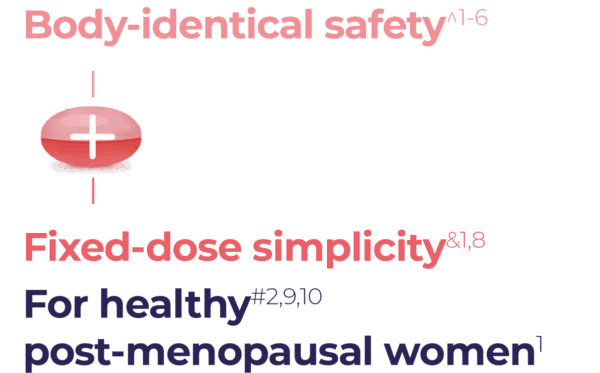 &In a 2024 Australian survey of women taking two component MHT (n=24), 72% of women (n=17) responded “yes” to “If your healthcare professional offered you both the estrogen and progesterone components in one tablet – would you prefer this over taking a two component MHT therapy (whereby you take a tablet and a patch/or gel)?”8 #Clinical evidence and guidelines support the use of low-dose oral estrogen and progesterone therapies in healthy postmenopausal women with no contraindications or conditions requiring supervision (e.g. past VTE, age > 65 with no prior MHT, established CVD). Refer to the Product Information for the full list.2,9,10