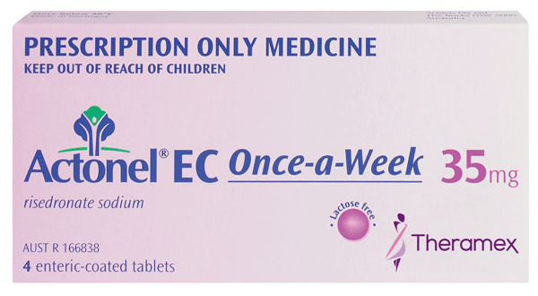 ACTONEL® EC 35MG ONCE-A-WEEK MINIMAL PRODUCT INFORMATION. INDICATIONS: Treatment of: 1) osteoporosis, 2) glucocorticoid-induced osteoporosis, 3) preservation of bone mineral density in patients on long term corticosteroid therapy. CONTRAINDICATIONS: Risedronate: Hypersensitivity to the drug or ingredients, hypocalcaemia, inability to stand or sit upright for at least 30 minutes. PRECAUTIONS: Risedronate: Hypocalcaemia; bone and mineral metabolism dysfunction; calcium and vitamin D if dietary intake is inadequate; severe renal impairment; oesophageal reaction, inflammatory bowel disease; osteonecrosis of the jaw; osteonecrosis of the external auditory canal; dental examination with preventive dentistry; avoid invasive dental procedures; atypical stress fractures; pregnancy (Category B3); certain medications (e.g. calcium supplements, antacids) should not be taken with Actonel EC; patients with a history of oesophagitis, gastritis, oesophageal ulcerations and gastroduodenal ulcerations. INTERACTIONS: Risedronate does not induce or inhibit CYP450 enzymes. ADVERSE EVENTS: Risedronate: Very Common: nasopharyngitis. Common: abdominal and musculoskeletal pain, influenza, urinary tract infection, bronchitis, diarrhoea, constipation, vomiting, nausea, arthralgia, back pain, hypertension, hypercholesterolaemia. DOSAGE AND ADMINISTRATION: Tablet needs to be swallowed as a whole with plain water in an upright position (patient needs to stay upright for 30 minutes). STORAGE: store below 30°C. Refer to full PI before prescribing. Based on the PI last updated 31 March 2025.